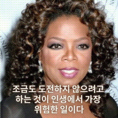 ‘조금도 도전하지 않으려 하는 것이 인생에서 가장 위험한 일이다.’ 어린 시절 당한 성폭행으로 일찍 미혼녀가 되어 온갖 고생을 하고서도 끝내 성공 여성의 모범 격으로 떠오른 명 사회자 겸 인생 조언자 오프라 윈프리의 말이다. 방송과 책 출간으로 억만장자가 된 그녀는 그 돈을 어려운 이들 돕기 쪽에 거의 모두를 쓰고 있고, 수많은 이들의 정신적인 멘토로 받들리고 있다.