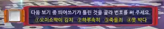 일반 맞춤법 관련 문제로는 처음으로 띄어쓰기 문제가 나왔다. 위에서 언급한 것처럼 기본적인 사항이었음에도 한 사람도 정답을 적지 못했다. 공부량과 공부 자료의 문제가 엿보이는 대목이었다.